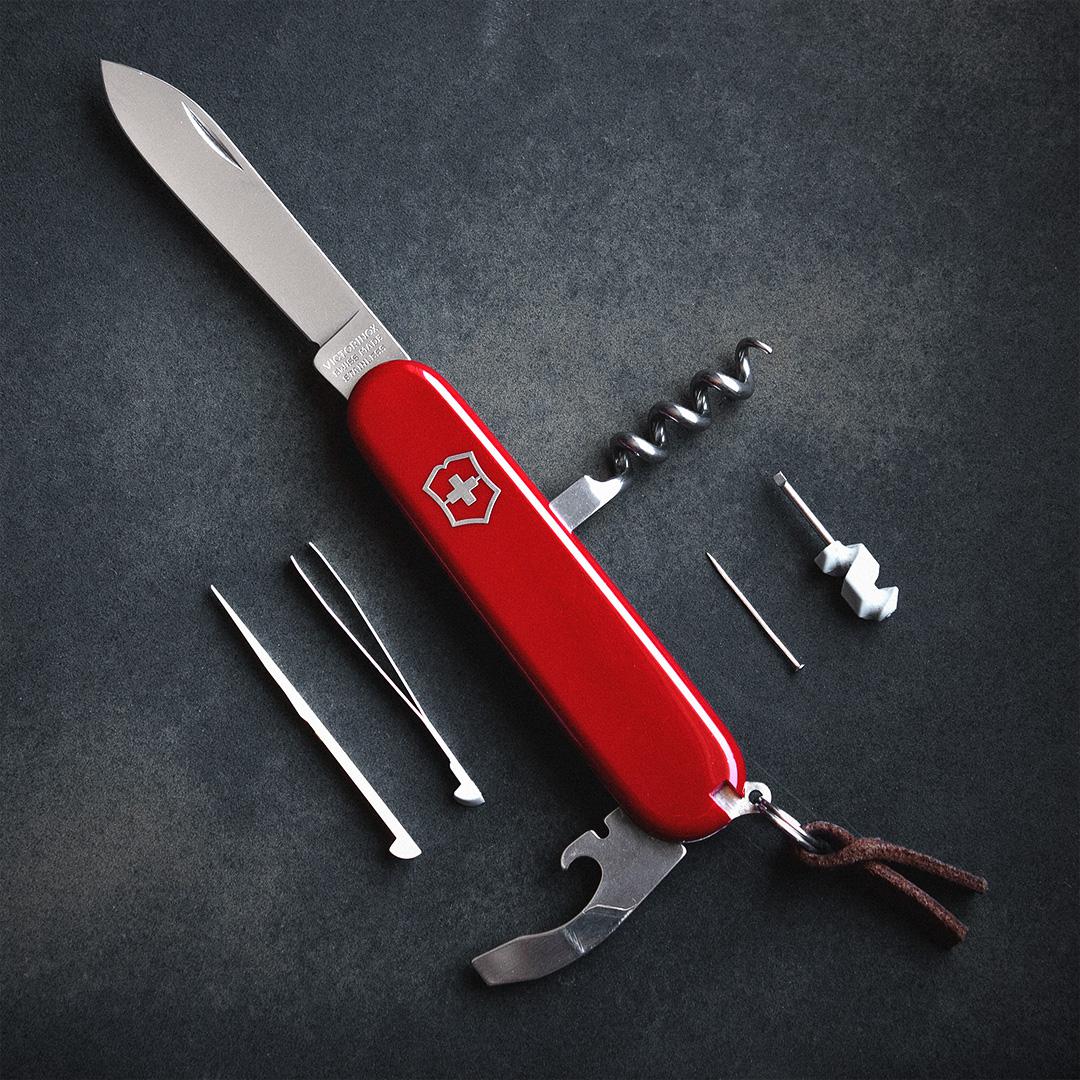 The classic and timeless Victorinox pocket knife with nine functions: a large blade, corkscrew, key ring, bottle and can opener, screwdriver with wirestripper, tweezers and toothpick.
